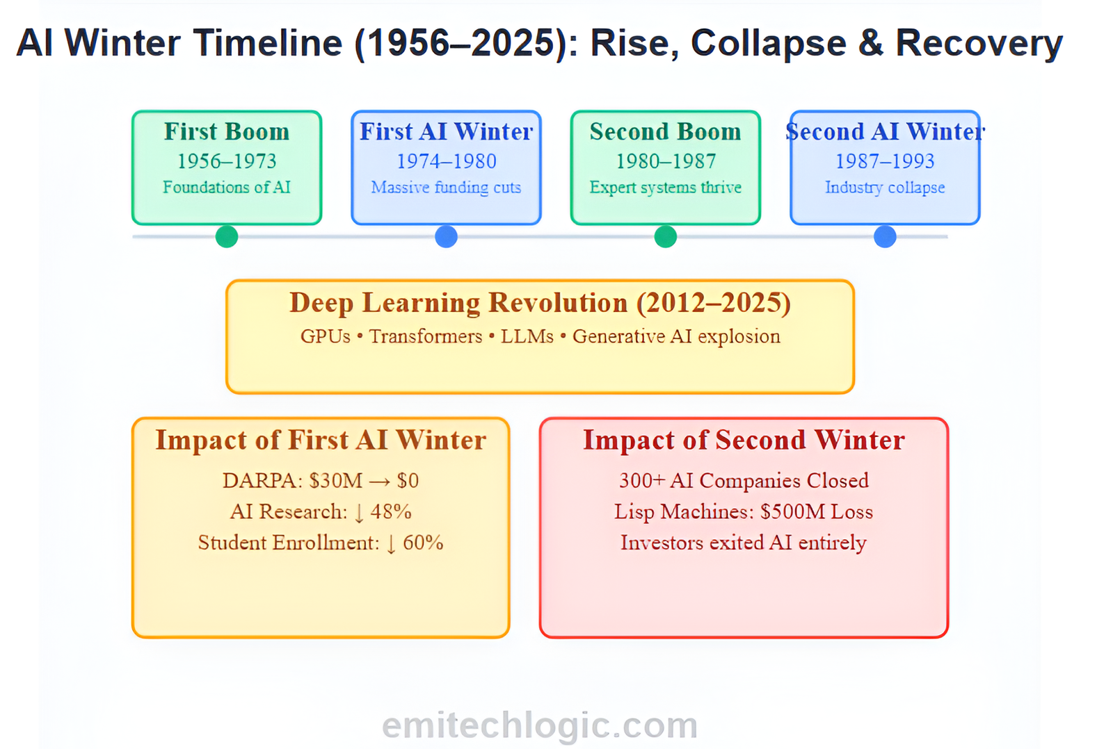 In 1973, the British government asked physicist James Lighthill to review progress in artificial intelligence research. His report concluded that researchers had not achieved their stated objectives. Within a year, UK funding for AI research dropped sharply. Many programs closed. This pattern repeated across multiple countries between 1974 and 1980, then again from 1987 to 1993. Researchers coined the term “AI Winter” to describe these periods when funding dried up, companies failed, and the field nearly disappeared. Understanding what happened helps you make informed decisions about AI careers, business investments, and technology adoption today.