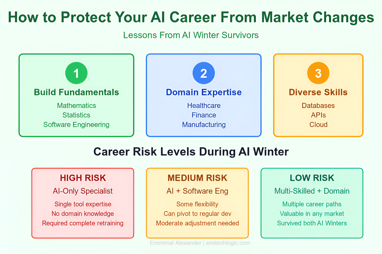 During previous AI Winters, professionals with strong fundamentals successfully moved to adjacent fields. Knowledge engineers became business analysts. AI researchers moved into data science. Robotics engineers worked in automation.