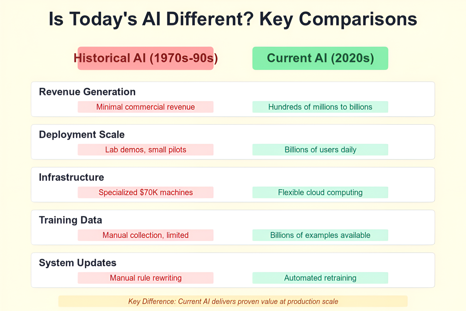 Scale of deployment and revenue generation. Historical AI remained largely in research labs with minimal commercial revenue. Current AI operates in production environments serving billions of users and generating substantial revenue across multiple industries.