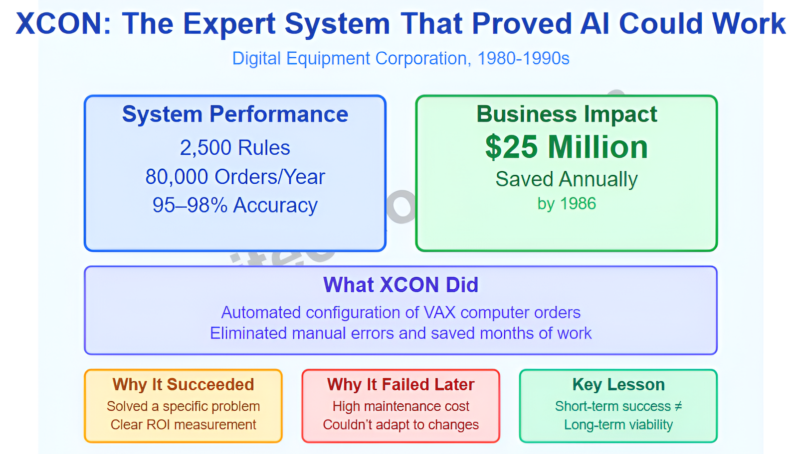 The system contained approximately 2,500 rules encoding knowledge about computer component compatibility. By 1986, XCON processed 80,000 orders annually with 95-98 percent accuracy. DEC estimated annual savings of $25 million from reduced errors and faster processing.