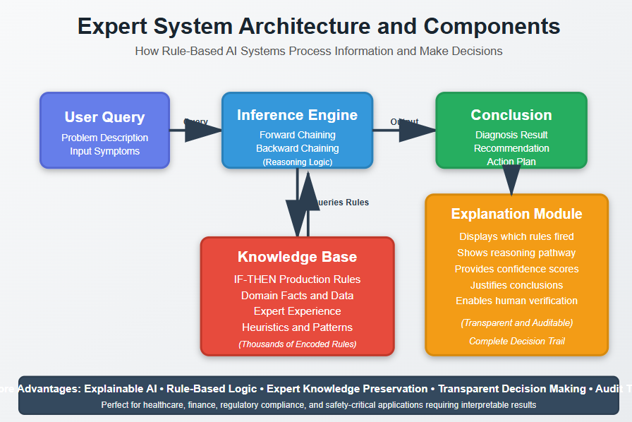 Expert systems always explained their reasoning. This transparency mattered in medicine, finance, and law where people needed to understand and verify decisions.