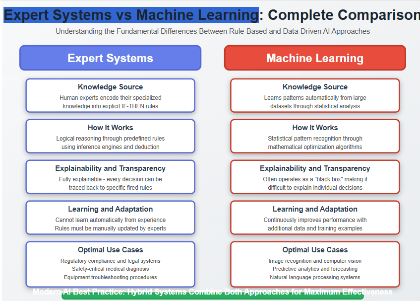 Here is the big difference: Expert systems use clear rules that humans write down. Modern machine learning finds patterns in data automatically. Neither approach is always better. The right choice depends on your specific problem.