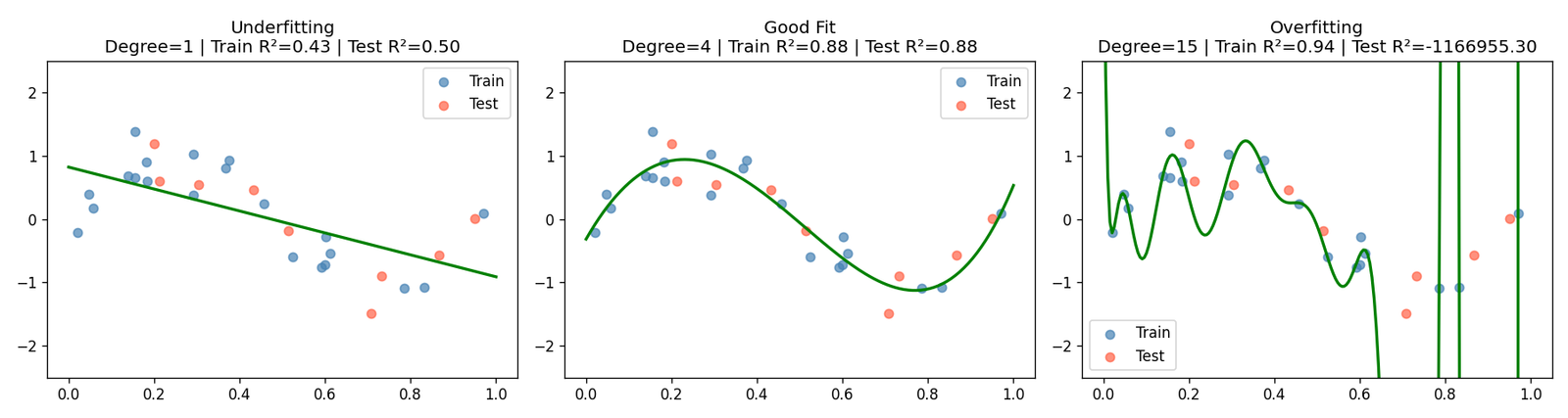 The degree-15 model achieves an R² close to 1.0 on the training set and a sharply negative R² on the test set — it has learned the noise so thoroughly that it can’t generalise to points a few millimetres away on the x-axis. Degree-1 is the opposite failure: it has the capacity of a ruler.