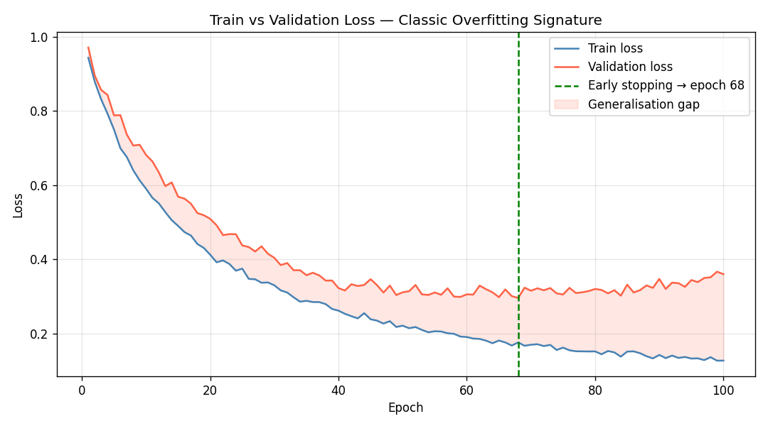 The shaded region between the two curves in Figure 4 is the generalisation gap — the performance you’re giving up to memorisation. Early stopping is simply agreeing to save the checkpoint at the leftmost edge of that shaded region [5].