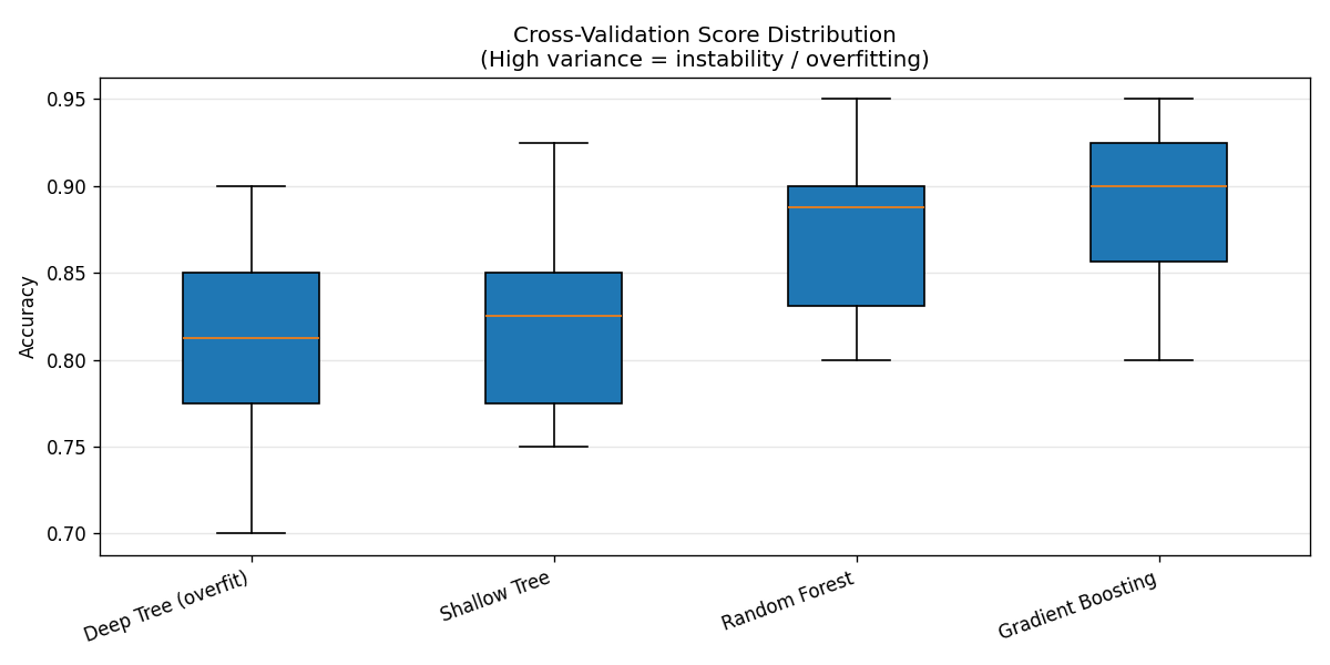 The box plot makes the instability visible. The deep tree’s wide interquartile range means its performance is highly sensitive to which 10% of the data ends up in the validation fold — it has memorised patterns that only hold for certain data subsets. Ensembles shrink this variance dramatically, which is one of the reasons they’re so reliable in practice [8].