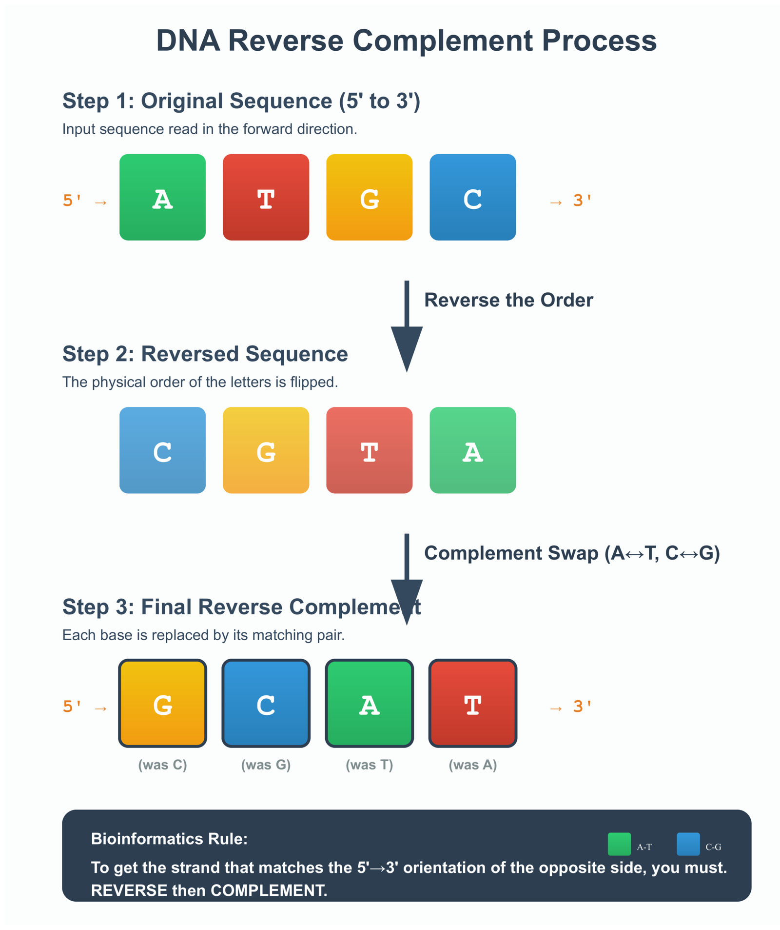 print(reverse_complement("ATCGGCTA")) # Output: "TAGCCGAT"This is critical in bioinformatics for analyzing both DNA strands accurately.