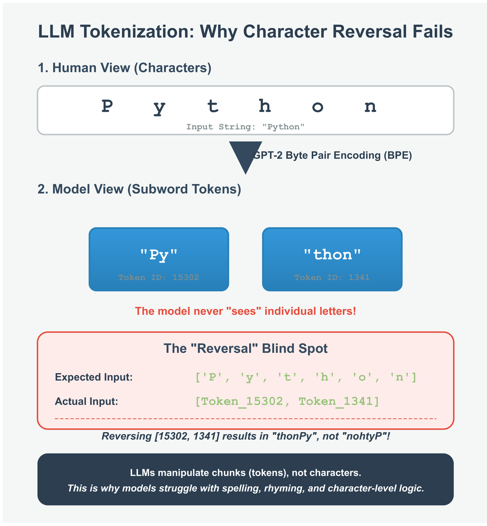 Large language models use subword tokenization (e.g., BPE), breaking text into tokens rather than individual characters. “Strawberry” might become tokens like [“straw”, “berry”], so the model never “sees” the exact letter sequence. This causes errors in character-level tasks, even though LLMs excel at pattern-based text generation.