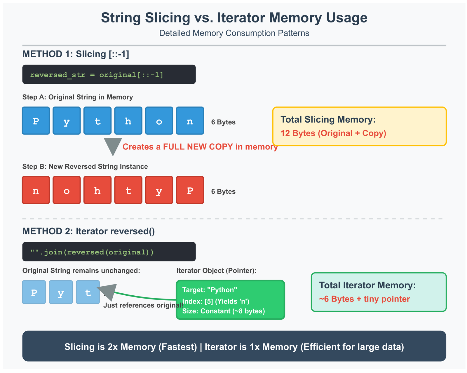 Slicing creates a complete copy of the string in memory, doubling peak usage (O(n) space). The reversed() function returns a lazy iterator that only stores a reference and index (near O(1) extra space until materialization). This makes iterators ideal for large files (e.g., 500+ MB logs) to avoid crashes in memory-constrained environments like Docker.