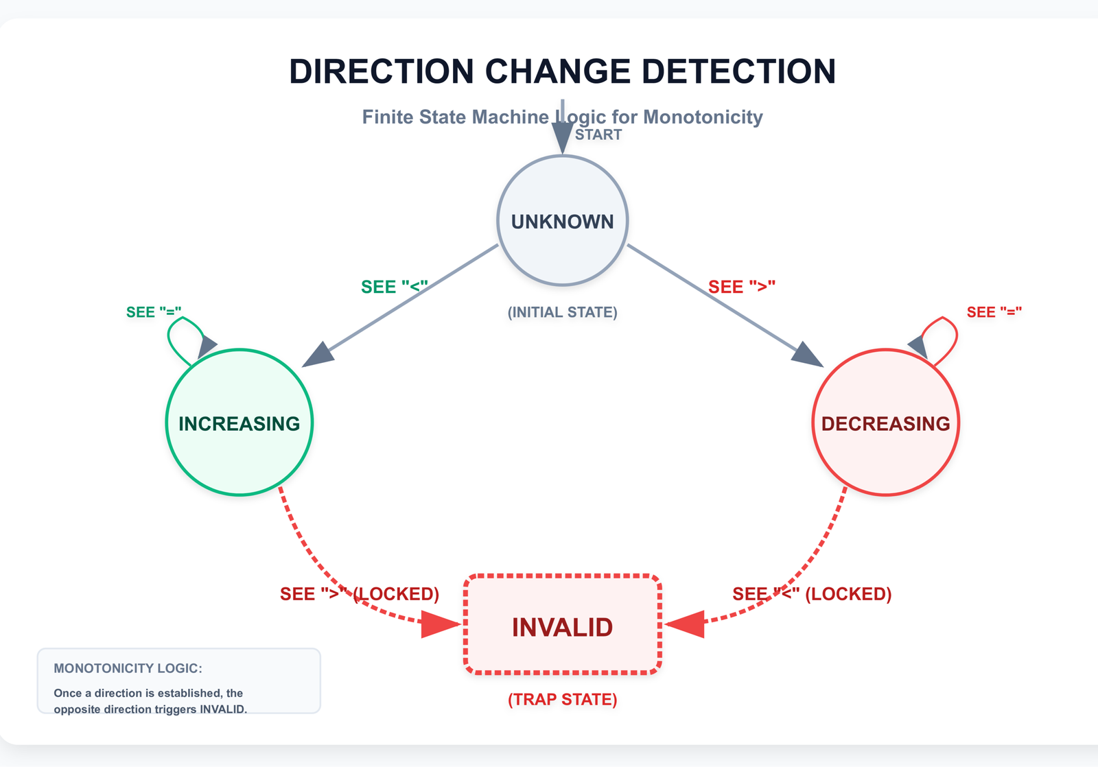This approach maintains two boolean flags: one tracking whether the sequence could still be increasing, and one tracking whether it could still be decreasing. As we iterate through consecutive pairs: