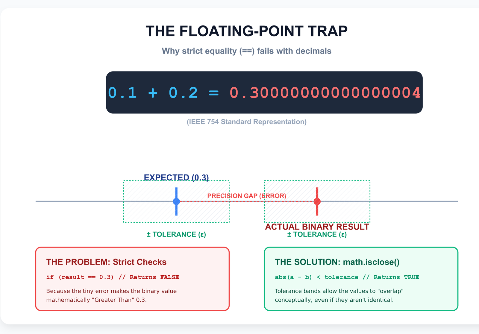 math.isclose() handles both relative and absolute tolerance, which is more robust than a simple epsilon comparison. This is especially important in quantitative finance and machine learning contexts where floating-point values come from iterative calculations. The relative tolerance scales with the magnitude of the numbers, while absolute tolerance handles values near zero.