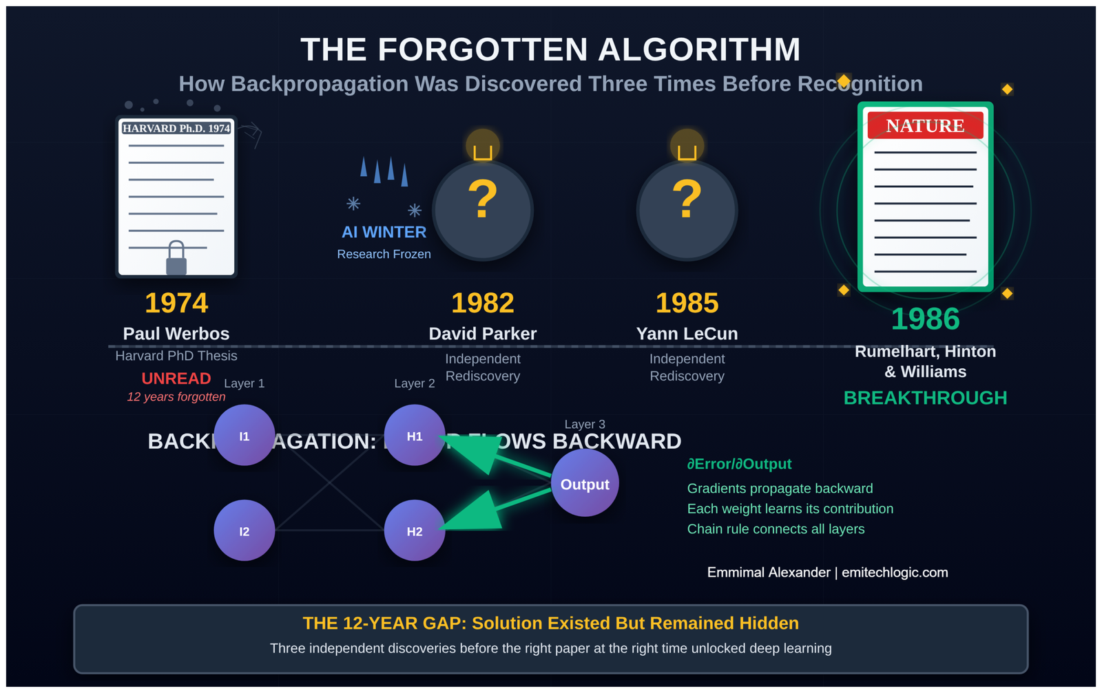 Nobody noticed. The AI winter had frozen the field. Few researchers even looked at neural network papers. Werbos’s thesis sat unread in the Harvard library. The solution existed but remained unknown for over a decade.