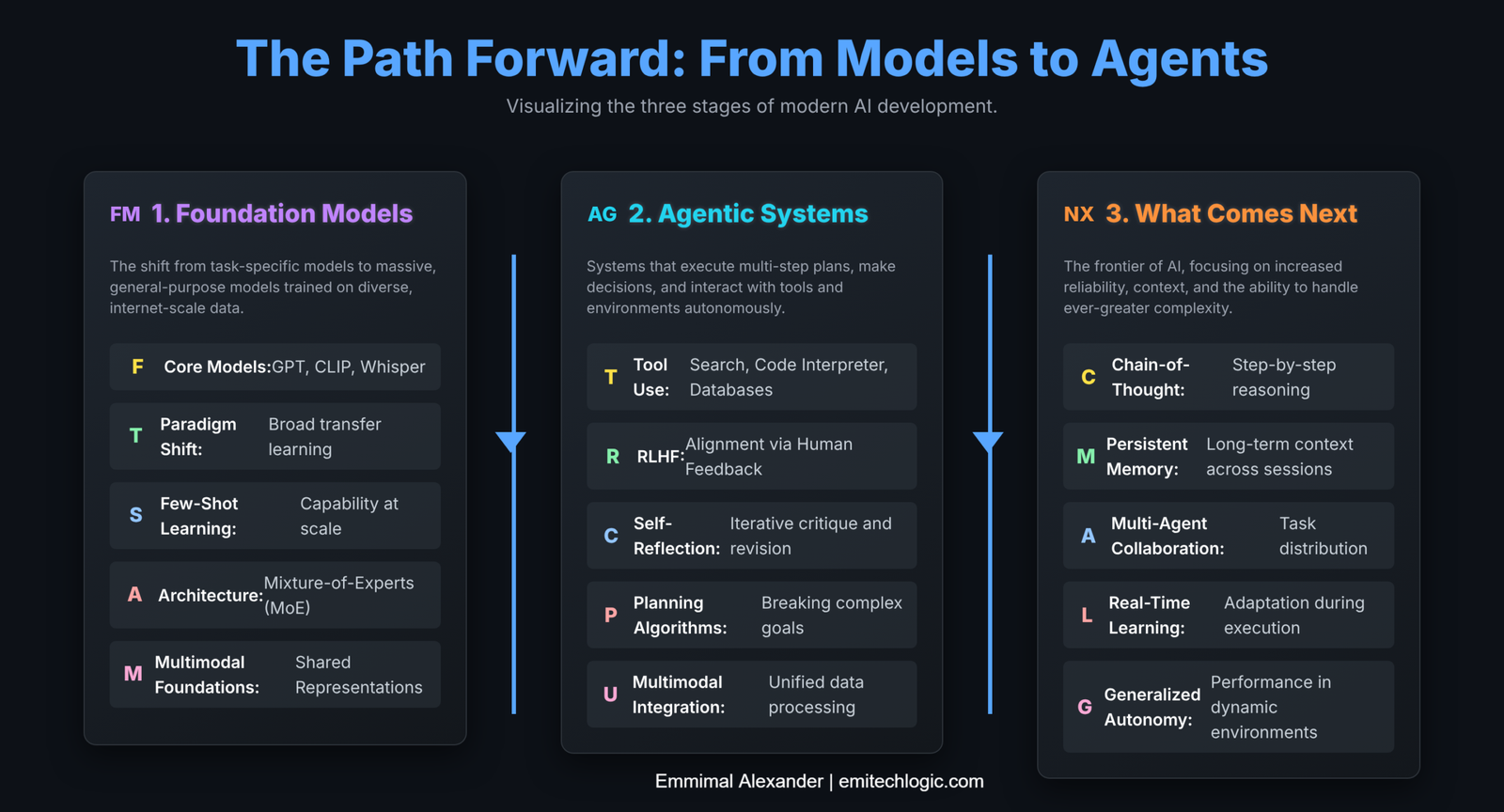 Neural networks are evolving toward foundation models that serve multiple tasks, multimodal systems that process different data types together, and agentic architectures that take autonomous action. Future systems will combine reasoning with tool use and real-time learning. Models will become more efficient through sparse activation. Self-improving systems will learn from interaction and feedback. The trajectory points toward increasingly capable and generalizable artificial intelligence grounded in neural network foundations developed over seven decades.