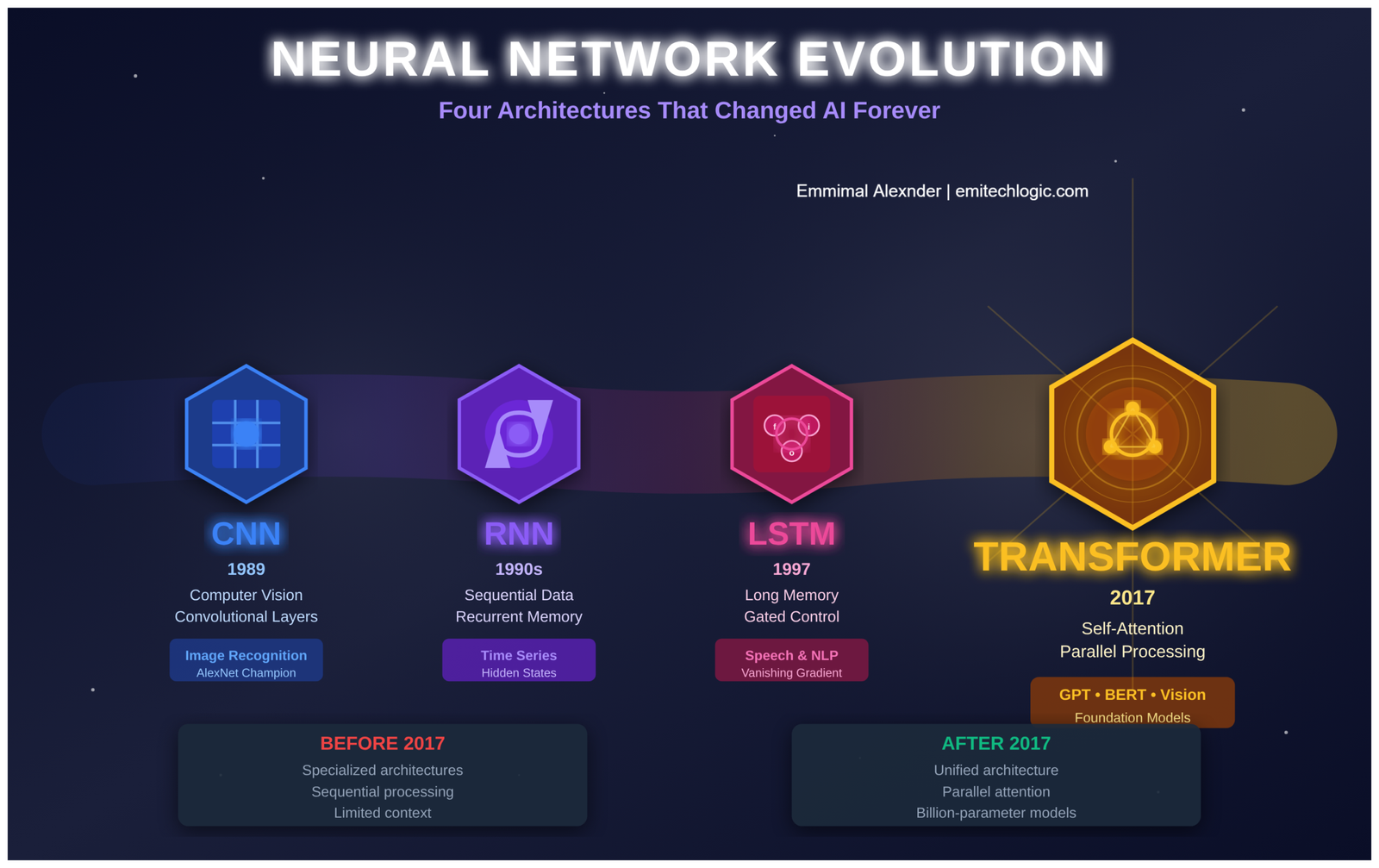 The Rise of Neural Networks: Seven decades of breakthroughs from McCulloch-Pitts neurons (1943) through backpropagation (1986), GPU-powered deep learning (2012), to transformer architectures (2017) that power modern AI systems.