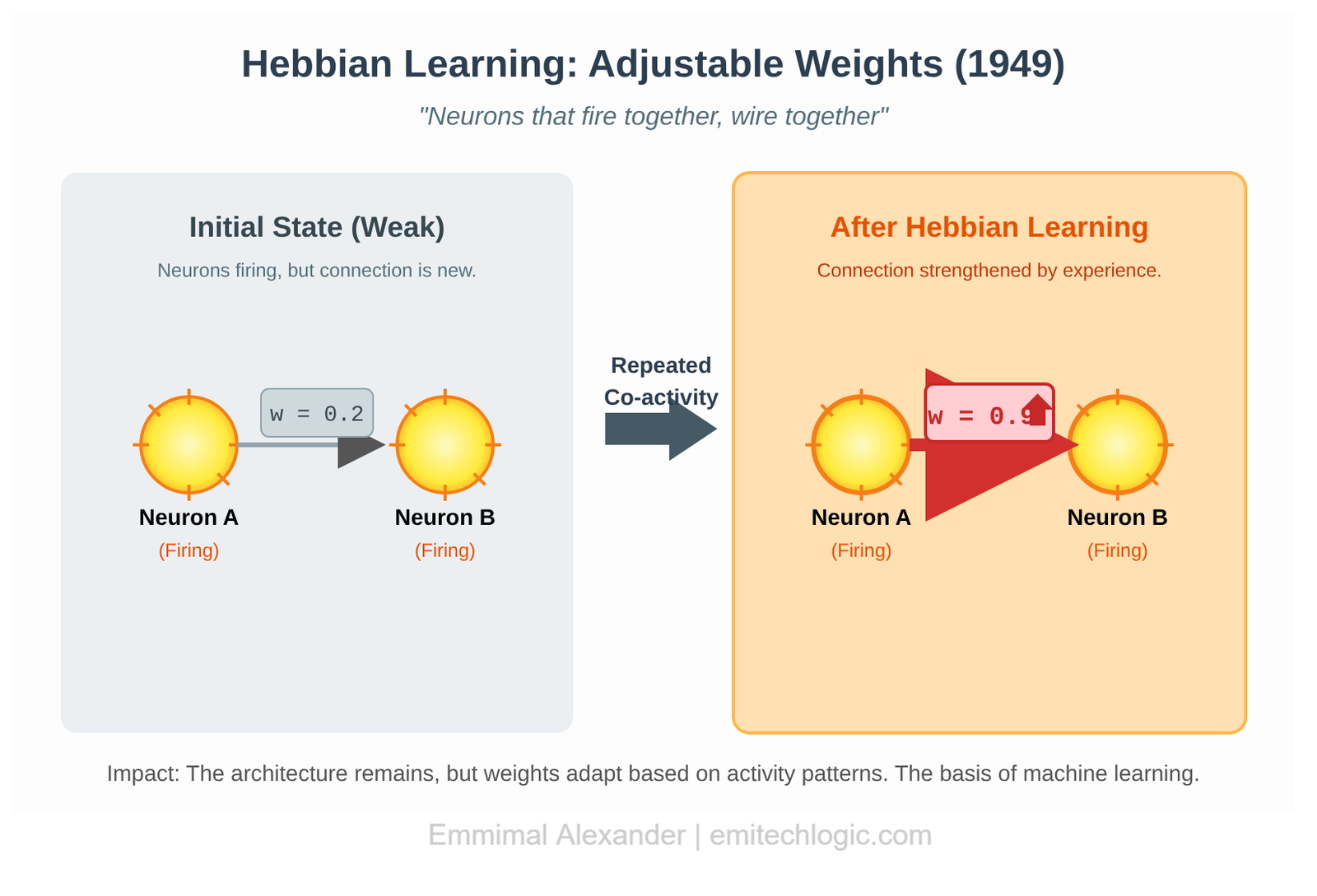 Hebb’s rule meant that connection weights could change based on activity patterns. A network could start with random weights and gradually develop useful connections through experience. This was the missing piece. The McCulloch-Pitts neuron provided the architecture. Hebbian learning provided the adaptation mechanism.