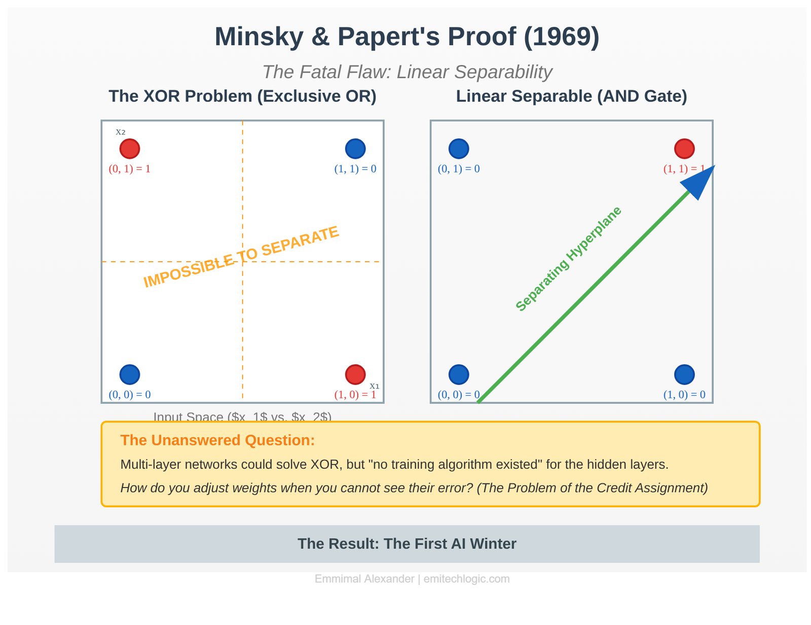 Marvin Minsky and Seymour Papert published their book “Perceptrons” in 1969. It was a mathematical assassination. They proved that single-layer perceptrons could only solve linearly separable problems. If you cannot draw a straight line separating your classes, a perceptron cannot learn them. Period.