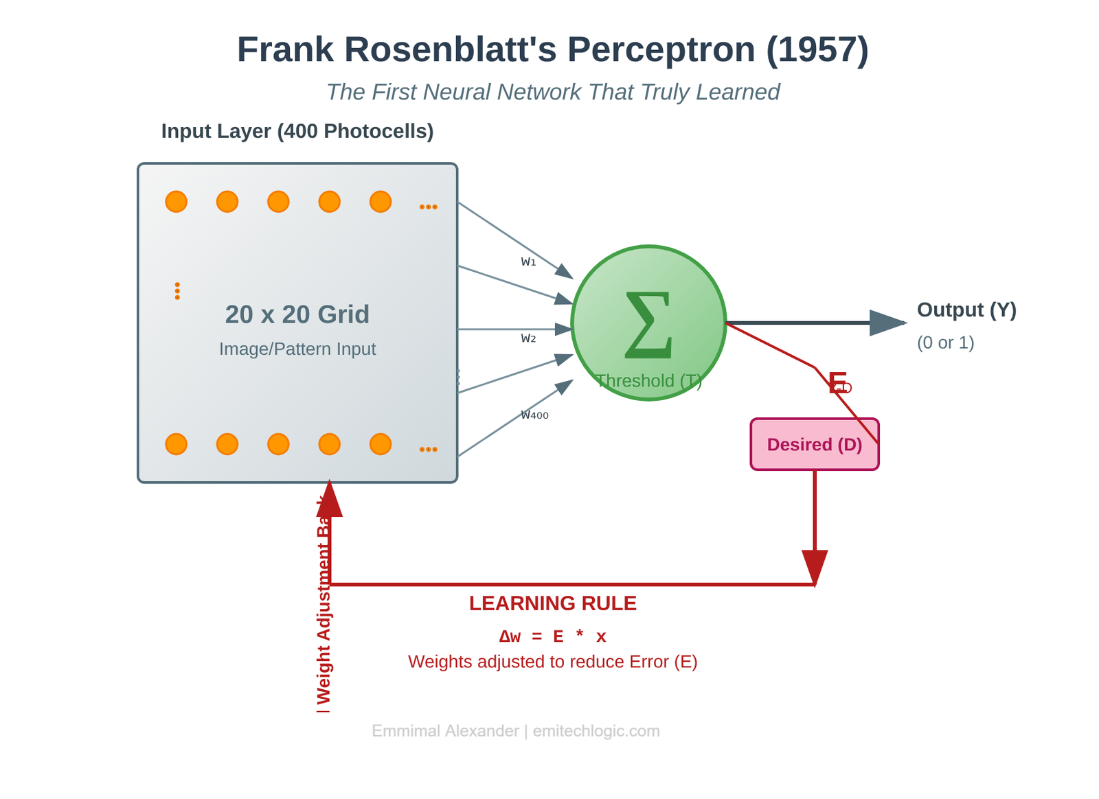 Frank Rosenblatt’s perceptron algorithm in 1957 was the first neural network that could genuinely learn from examples. Feed it input-output pairs. When it made an error, it automatically adjusted its weights to reduce that error. This was revolutionary. A machine that programmed itself.