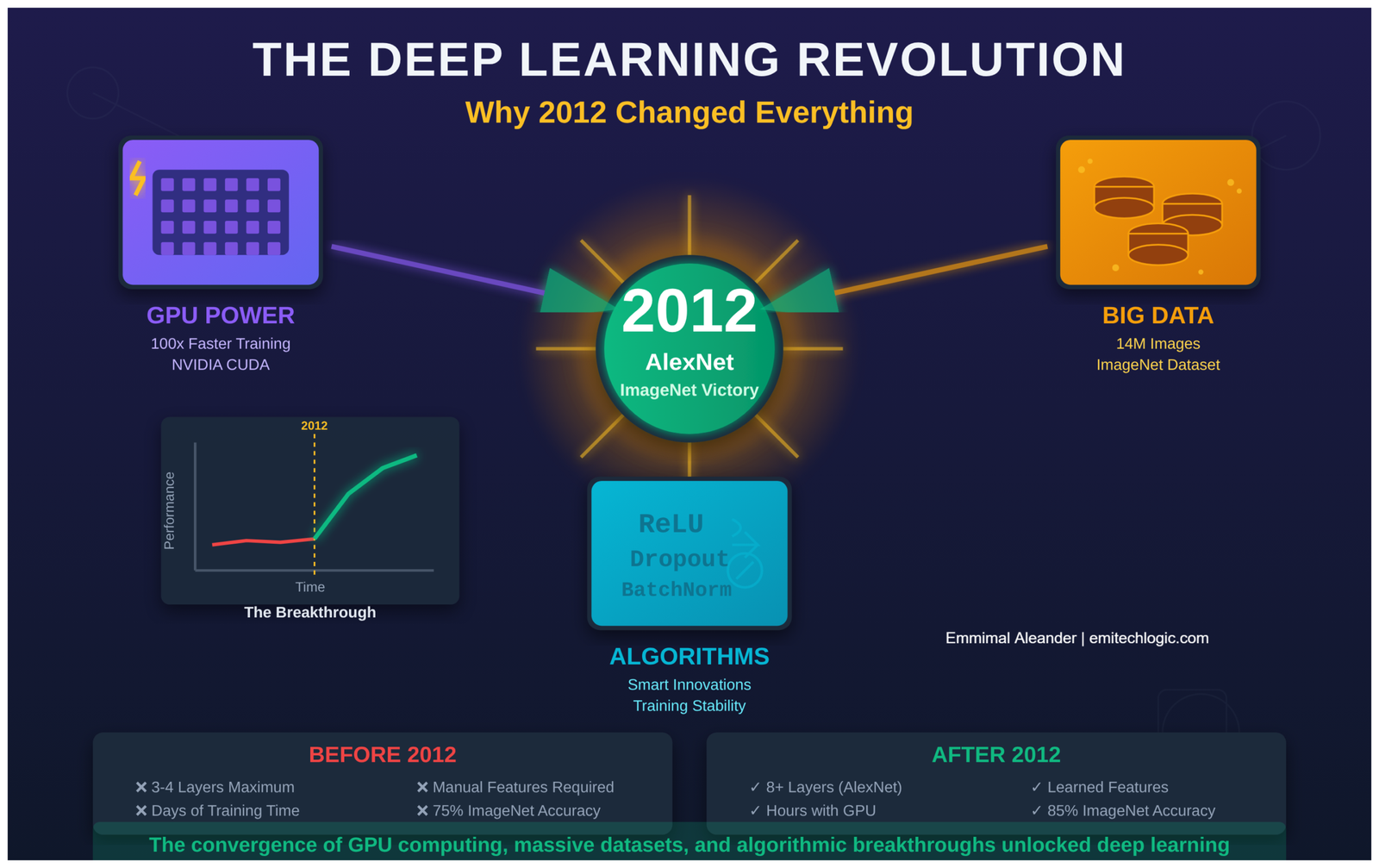 Three factors converged around 2012. GPU computing provided the computational power to train deep networks. Large datasets like ImageNet provided sufficient examples to prevent overfitting. Algorithmic improvements like ReLU activations and dropout regularization stabilized training. No single breakthrough explains the rise. The combination of better hardware, more data, and refined algorithms created the deep learning revolution.
