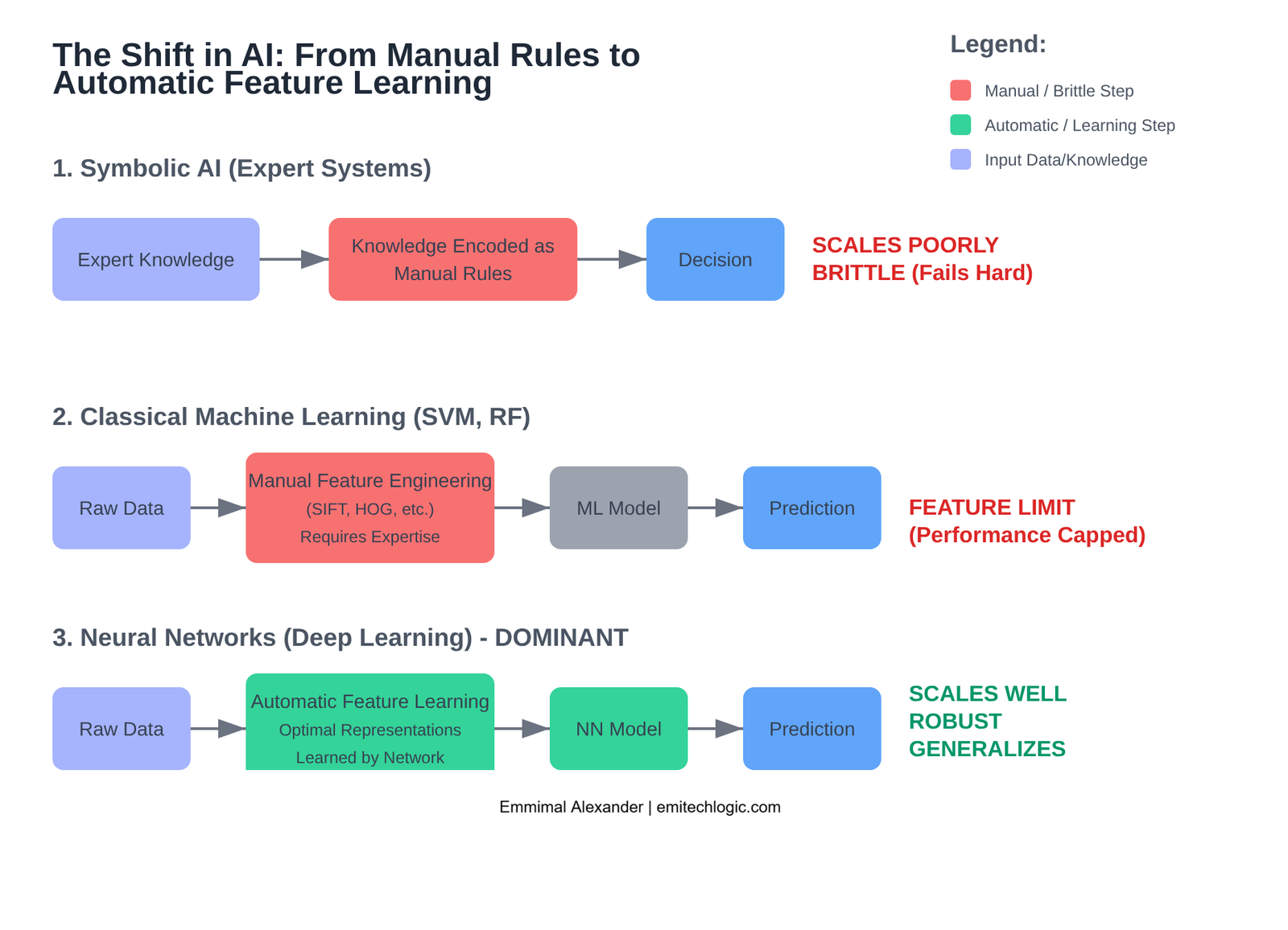 Neural networks inverted the knowledge engineering process. Instead of experts encoding rules, networks discovered patterns from examples. Show a network a million labeled images. It learns to recognize objects. Show it translated sentence pairs. It learns translation. The same learning algorithm works across domains.