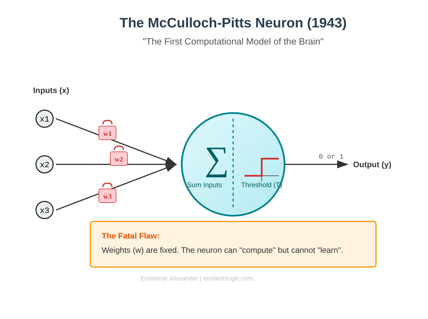 But the McCulloch-Pitts model had a fatal flaw for practical applications. The weights were fixed. You had to set them correctly before running the network. There was no learning. No way for the system to improve from experience. The model explained how a brain might work, but not how a brain might learn.