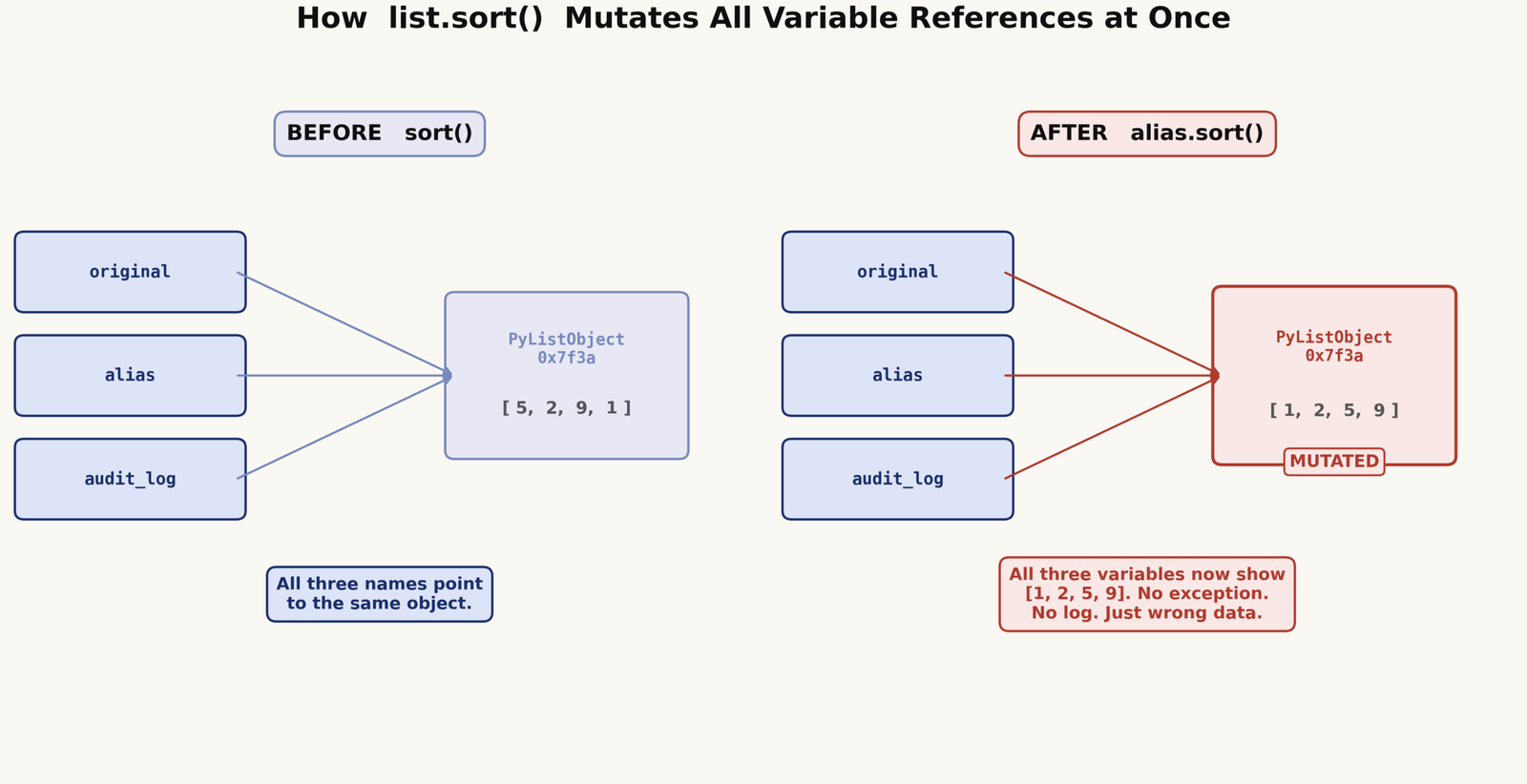 The function sorted the caller’s list. audit_log still holds a reference to raw, so it also shows the sorted version. There was no crash, no exception — just missing data.