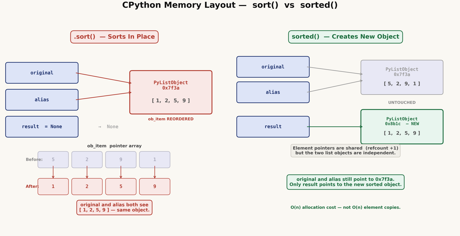 When sorted() runs, it creates a new PyListObject, copies the element pointers into it (incrementing reference counts along the way), and then sorts that new object. The original PyListObject is never touched. This is also why sorted() is safe to use with shared data — it never modifies the thing it was given. Python’s reference counting is covered in more detail in the Python garbage collection article if you want to understand how reference counts work in this context.