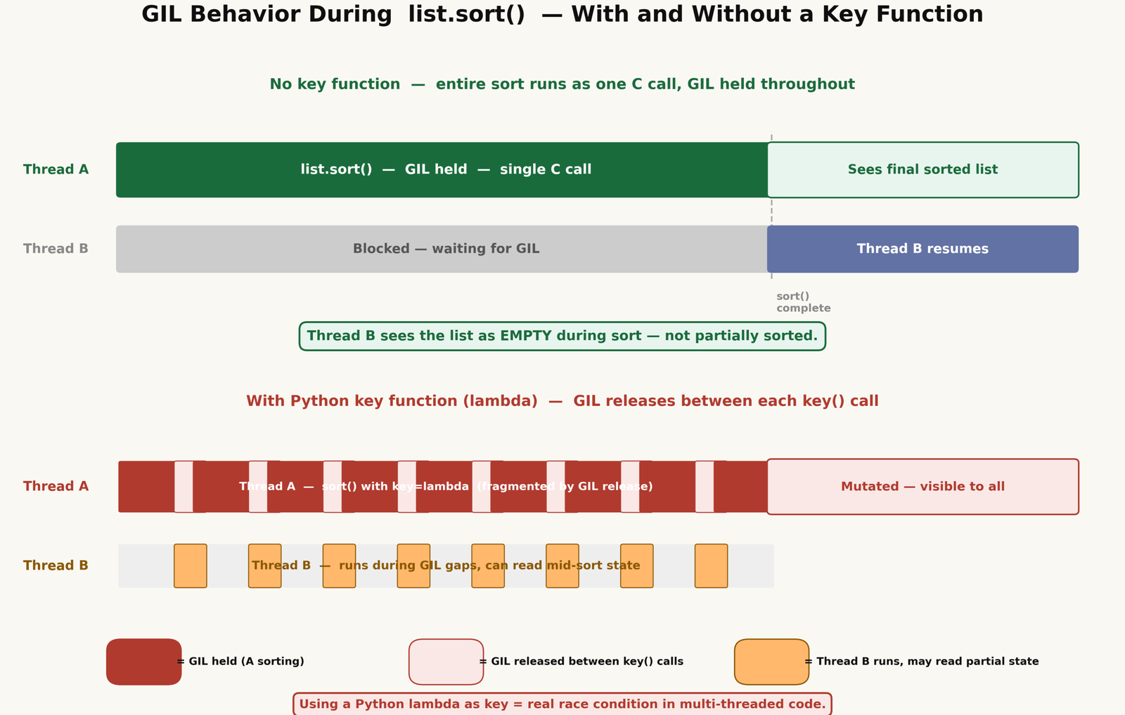 The picture changes when you use a Python-level key function, such as key=lambda x: x.score. Every time Timsort calls that lambda, it executes Python bytecode, and the GIL can be released between those calls. During those windows, another thread can read the list while it is mid-sort. So partially sorted views are possible — but only when a Python key function is involved.