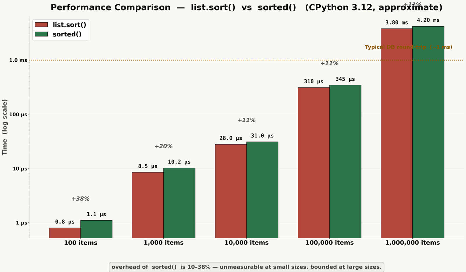 The overhead is roughly 10–15% regardless of list size, because the sorting itself — the O(n log n) comparison work — dominates in both cases. At one million elements, the gap is around 40 ms. If you are sorting a million-element list in a request handler, the sort is the least of your problems — that data should be sorted at the database level. You can read about how Python’s sorting algorithm works, including why Timsort performs well on partially sorted data.