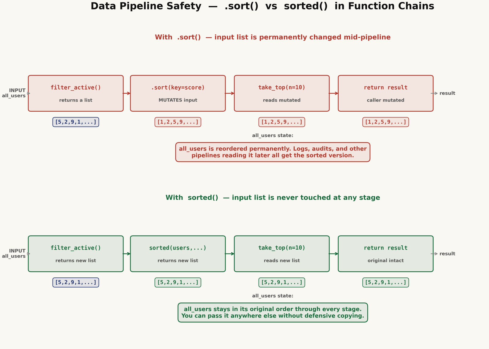 When data flows through a sequence of functions — filter, sort, transform, take the top N — each function ideally leaves its input unchanged. That way, you can test each step in isolation, pass the same input to multiple paths, and trust that the data at each stage is what you put in.